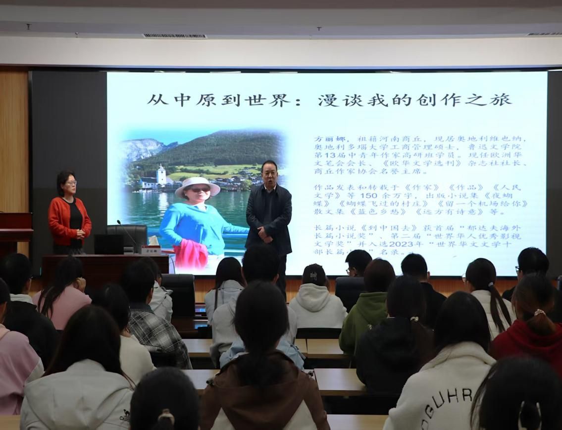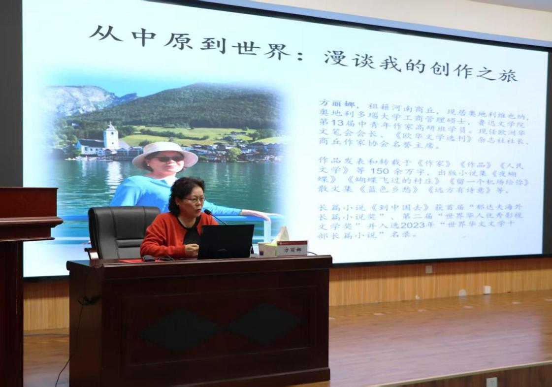 2025年10月22日上午,欧洲华文笔会会长、《欧华文学选刊》杂志社社长、商丘作家协会名誉主席方丽娜在行政楼一楼东报告厅为我校师生做了一场题为“从中原到世界:一个旅欧作家的文学创作之路”的文学创作专题讲座。讲座由人文学院党委书记、院长李金玉教授主持。人文学院部分教师、学校朝月文学社社员、人文学院“新荷作家班”成员和院刊“文韵”负责人等100余人参加了讲座。