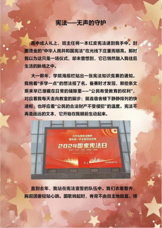 活动启动后,全院各班级学生积极响应、踊跃参与,纷纷以图文、视频等形式定格对宪法的理解与尊崇。在创作过程中,同学们跳出理论说教的框架,将宪法精神与校园生活、社会观察、个人成长紧密结合:有的以图文作品绘制宪法对青年权利的保障图谱,用生动笔触展现宪法与日常学习生活的紧密关联;有的通过心得随笔与影像叙事结合的方式,分享自身在学法、懂法、用法过程中的成长与蜕变。作品内容兼具思想深度与情感温度,既体现了青年学子对宪法内涵的深刻领悟,也展现了新时代青年尊法、信法、守法、用法的自觉意识。