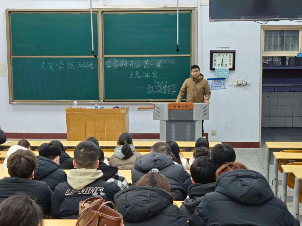为帮助学生快速调整状态、明确新学期目标,筑牢安全、学业、心理等多重防线,近日,人文学院精心组织开展2026年春季学期“开学第一课”主题班会,全院各年级、各专业全覆盖参与,教育成效显著。