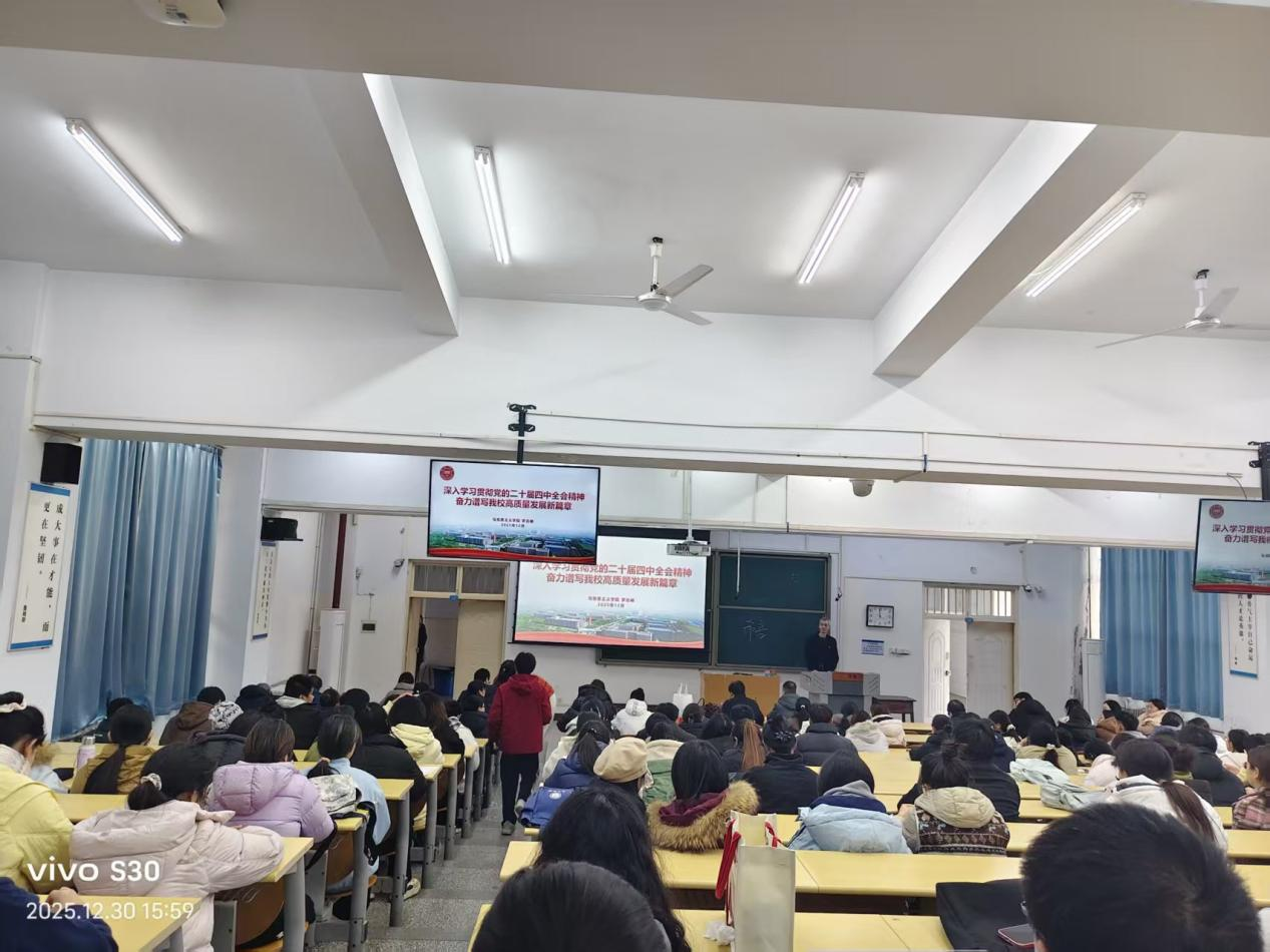 为深入学习宣传贯彻党的二十届四中全会精神,切实把全院师生思想和行动统一到党中央决策部署上来,推动全会精神与学院教育教学、学科建设等各项工作深度融合,2025年12月30日下午,人文学院特邀马克思主义学院罗志峰老师,作题为《深入学习贯彻党的二十届四中全会精神 奋力谱写我校高质量发展新篇章》的专题宣讲报告。学院全体教职工和学生代表参会,会议由学院副院长申红星主持。