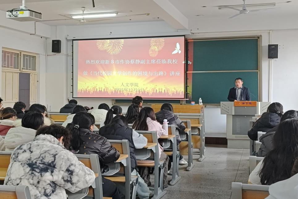 12月9日下午,人文学院邀请河南省作协会员、报告文学会员、新乡市作家协会副主席、区政协文史顾问蔡静老师,在A01-314教室为学院新荷作家班的70余名学生,作了一场题为“当代校园文学创作的困境与出路”的专题讲座。本次讲座由人文学院副院长申红星教授主持。