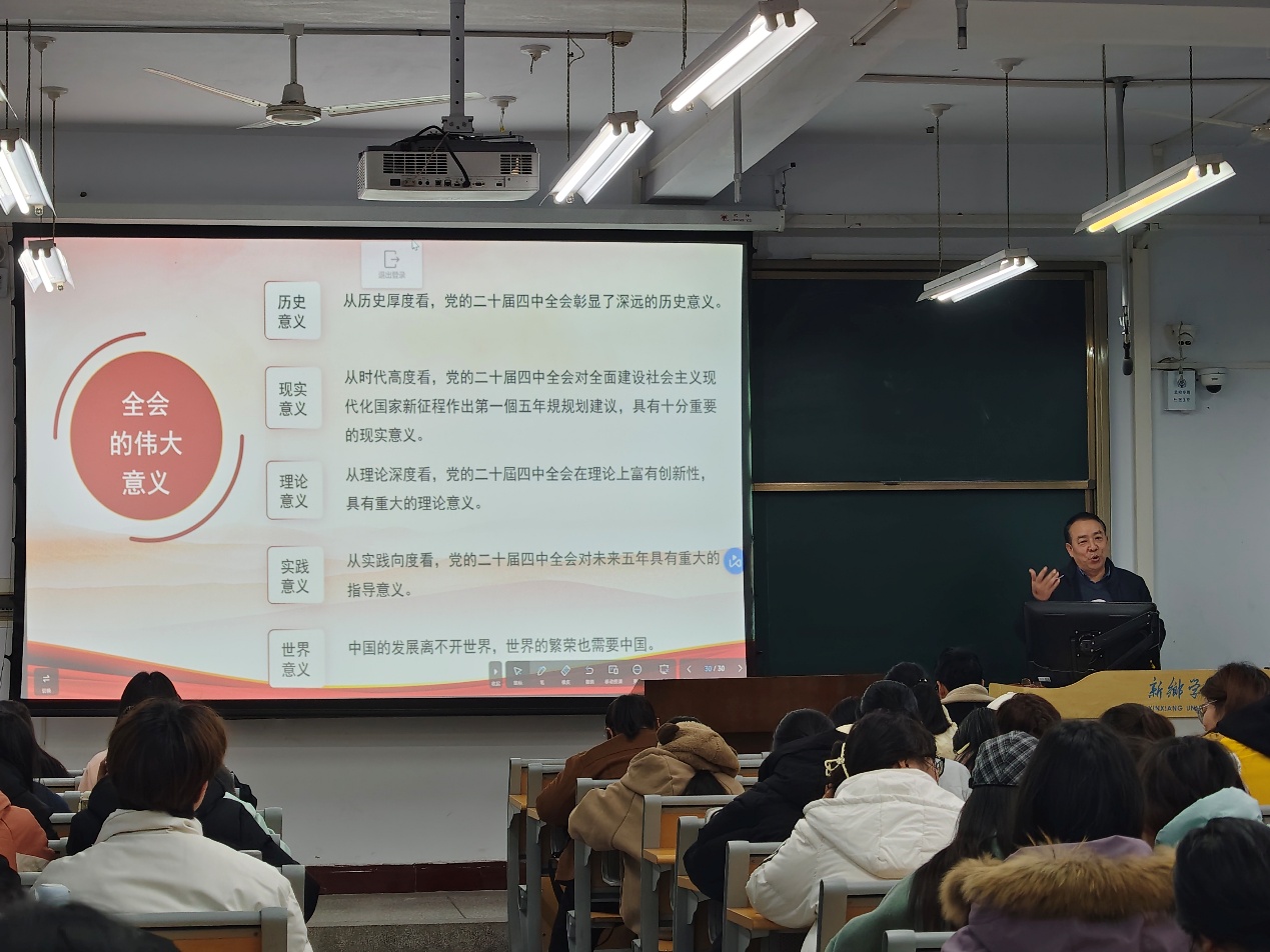 为推动党的二十届四中全会精神落地,人文学院党委于2025年11月18日16:00召开主题党日活动,学院党委书记、院长李金玉主讲,各学生支部书记、党员、入党积极分子共90余人参会。